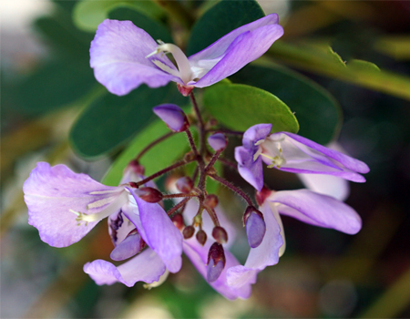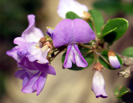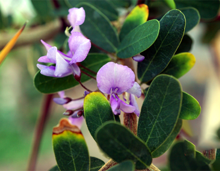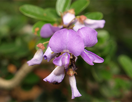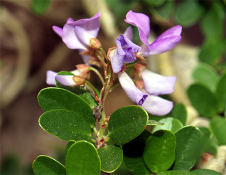 A small shrub, typically 2 to 5 meters tall, with a stem diameter of 5 to 7 cm. The stem is hard, exhibiting a white, mottled appearance, and features fine longitudinal cracks. Young branches are glabrous (hairless). At the tips of the young branches, there are 2-3 spines, 3-5 cm long, very sharp and hardened with age. Leaves are simple, small (8-18 mm), often clustered at the branch tips. They are stiff, with very fine venation, clearly visible on the upper surface. Stipules are early-deciduous (fall off early) but persist at the base of the leaves. Leaf petioles (stalks) are short, approximately 1-1.5 mm. Flowers grow in clusters at the branch tips and in the leaf axils (the angle between a leaf and the stem), are small, and deep purple, with numerous flowers. The fruit is a legume, borne in clusters, with the characteristic segmented appearance typical of the Desmodium genus.