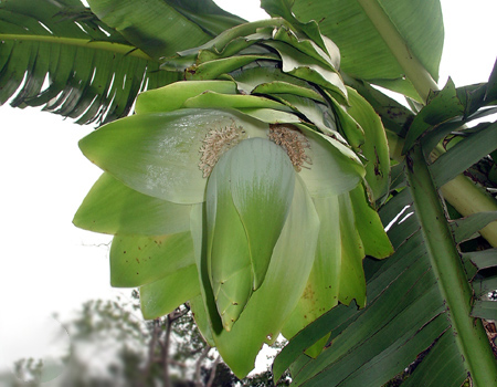 The pseudostem is solitary, reaching a height of 3-4 meters, with a very large, swollen base. The leaf blades are elongated, similar in size to other banana species, growing up to 1.5 meters long and exhibiting a glaucous green color. The inflorescence emerges on a common peduncle that inclines downward, ranging from 50 centimeters to 1 meter in length. The bracts are ovate, overlapping, forming a tapering, elongated spike, which is green and persistent (does not fall off). The fruit-bearing section of the inflorescence develops in two rows. The initial flower clusters are female, while the subsequent clusters are typically male. The fruits are elongated, measuring 10-12 cm in length and 3.5 cm in diameter. Seeds are few and approximately 1 cm in size, characterized by a uniform black color and a deeply indented hilum (scar).